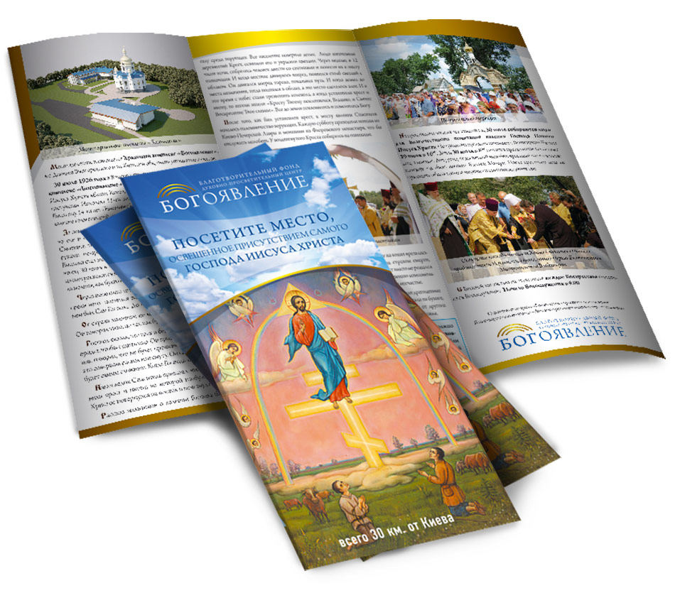 У нашу студію звернулися за створенням буклету для Храмового комплексу «БОГОЯВЛЕННЯ». На першому етапі було виконано рестайтинг логотипу, який відображає в собі сам комплекс та місце, освітлене присутністю Самого Господа. Потім було розроблено новий фірмовий стиль та дизайн буклету.