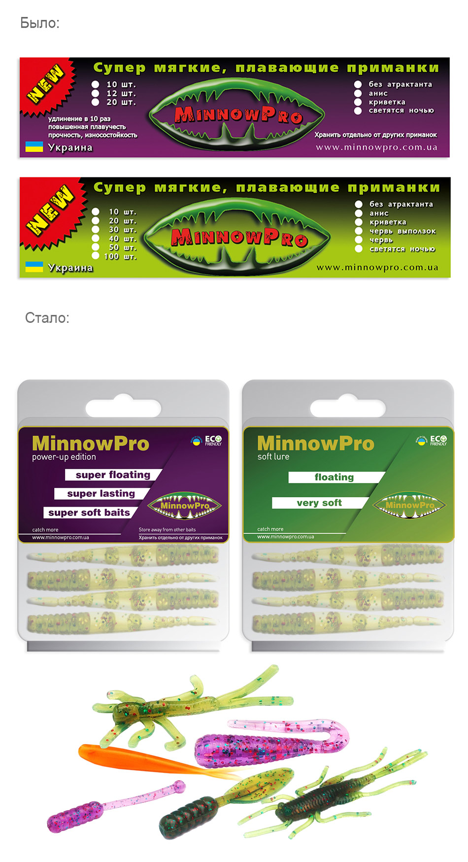 У нашу студію звернулися за редизайном логотипу ТМ "MinnowPro" та створенням нового дизайну етикетки для силіконових приманок. Новий логотип має бути розроблений на основі існуючого, тільки зроблений більш правильно з точки зору шрифту, дизайну, кращої читабельності та сприйняття бренду.