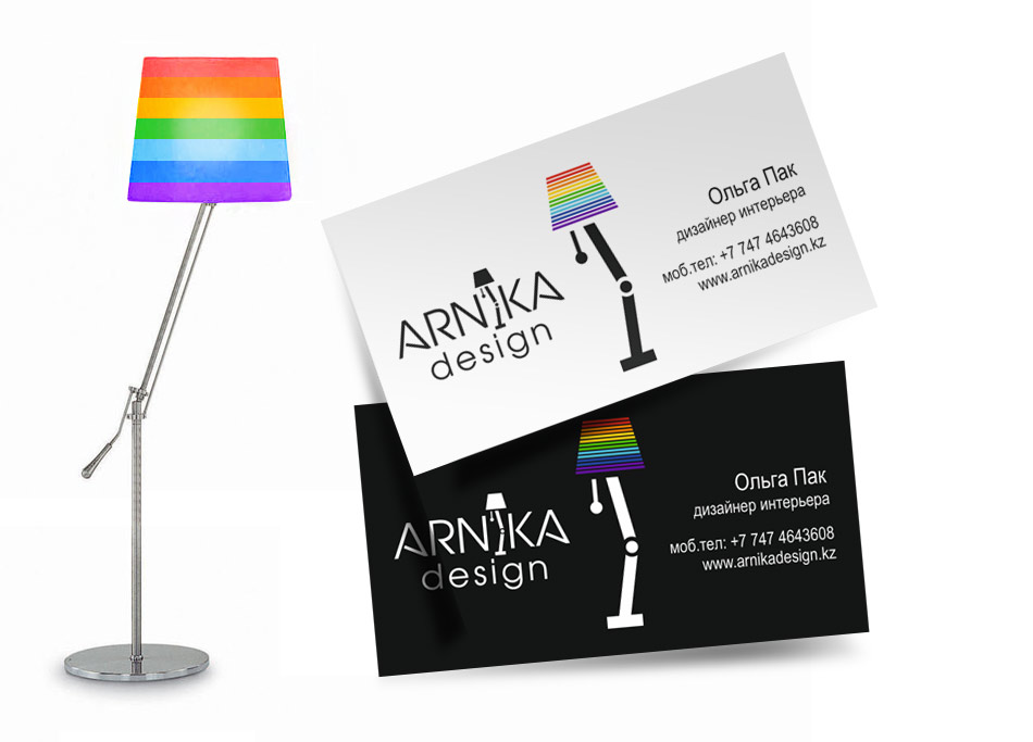 У додатку до логотипу було розроблено фірмовий стиль візитних карток: білий та чорний фон (день та ніч), що відображає постійну роботу студії над проектом Клієнта. Як відомо, геніальні ідеї спадають на думку не лише вдень, а й уночі. Кольорові лінії (райдуга) на торшері відображає багатогранність рішень та різноманітність стилів у дизайні інтер'єру.