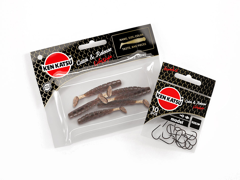 З урахуванням особливості логотипу та колірного рішення були розроблені дизайни упаковки для силіконових приманок та гачків. Фон виконаний у вигляді лусочок риби, щоб звернути на себе увагу і відразу показати сферу застосування та використання.