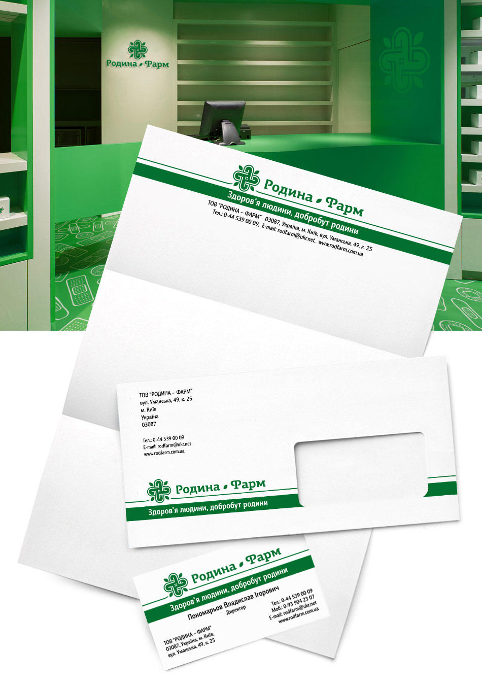 Після розробки фірмового стилю на основі візитних карток, бланків та конвертів, його потім застосовують на вивісці, зовнішньому оформленні вітрини (вікна та двері аптеки), дизайні самого приміщення, касової стійки, штендерах, друкованої рекламної продукції ( буклетах, каталогах, флаєрах), одязі персоналу (у тому числі на бейджах) і т.д.
