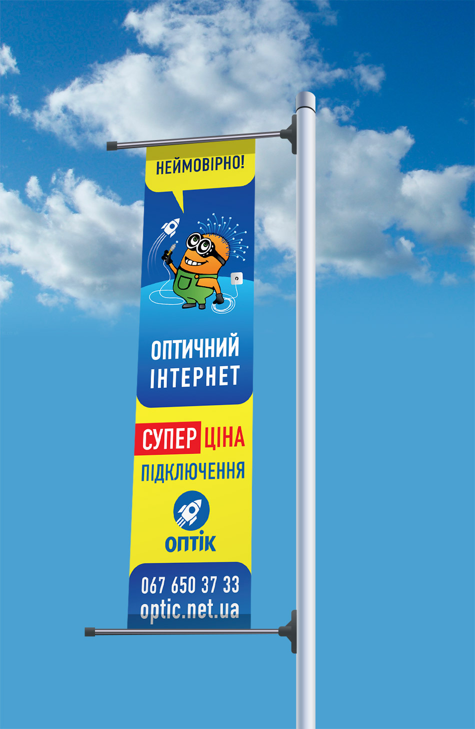 Для активного просування послуги на ринку було розроблено персонажа, який допоможе компанії виділитися серед конкурентів. Як персонаж був створений яскравий і незабутній фахівець OПТІК, який допомагає провести та підключити волоконно-оптичну кабельну мережу до будинку. Окуляри, уніформа, волосся персонажа у вигляді оптики – все говорить про надійного та досвідченого помічника, на якого можна покластися. Прообразом даного персонажа послужив усіма відомий образ міньйону з мультфільму.