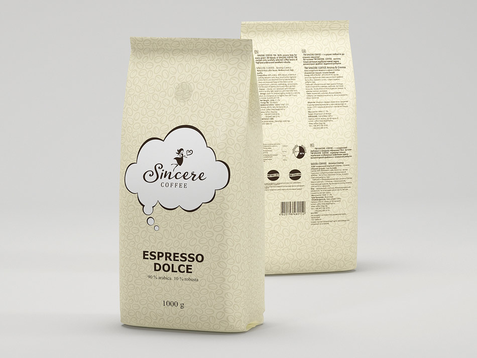 Графічний дизайн вакуумної упаковки кави Sincere Coffee був розроблений у стилі мінімалізм - поєднання двох контрастних кольорів, простота та лаконічність образів, гра шрифтів.