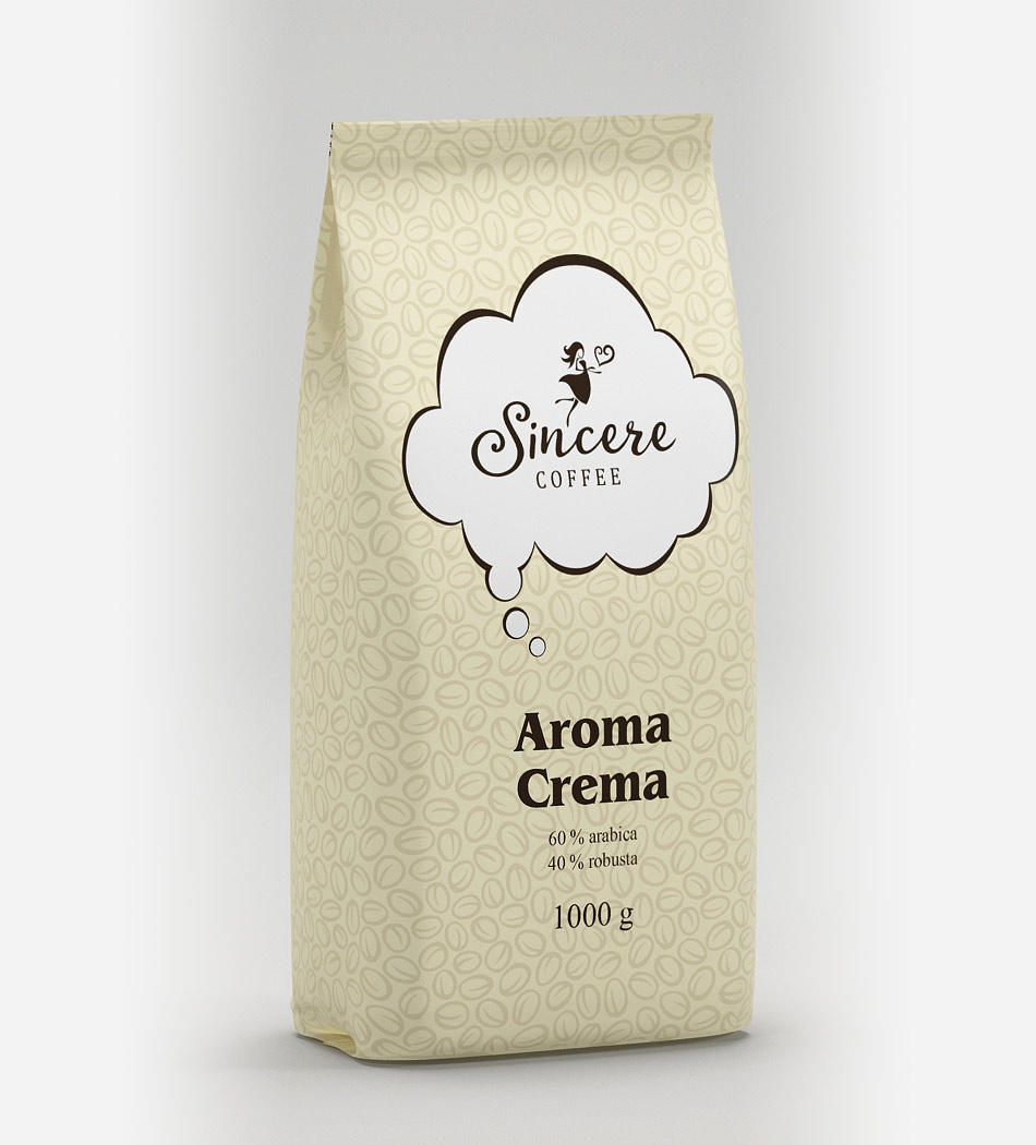 ТМ Sincere COFFEE, Aroma Crema - кава натуральна смажена в зернах. Ступінь обсмажування середня. Сорт Вищий. Глибокий і збалансований смак даного бленду можна порівняти з ніжним, чарівним, чуттєвим вальсом. Купаж Aroma-Crema відмінно поєднується з молоком.