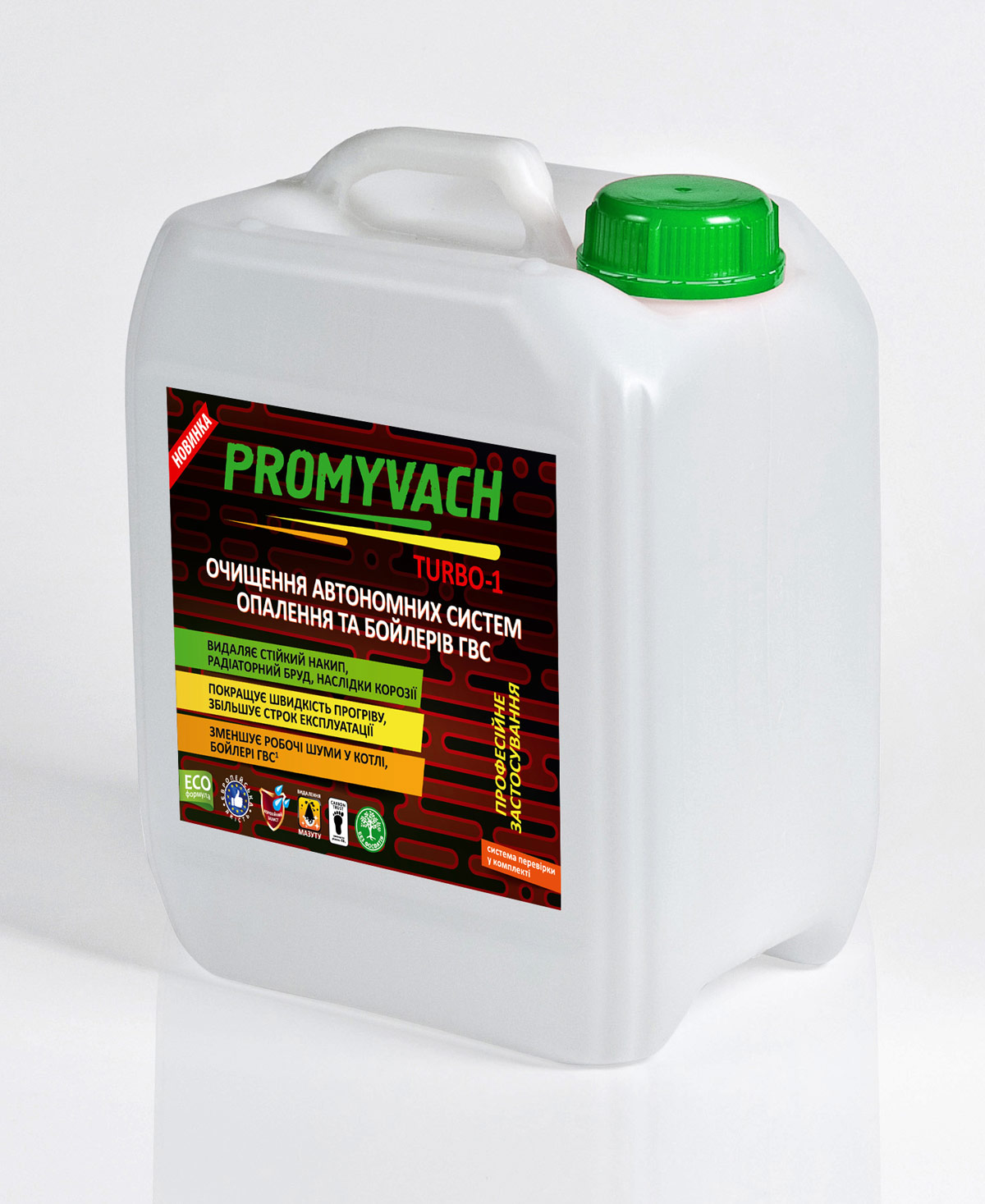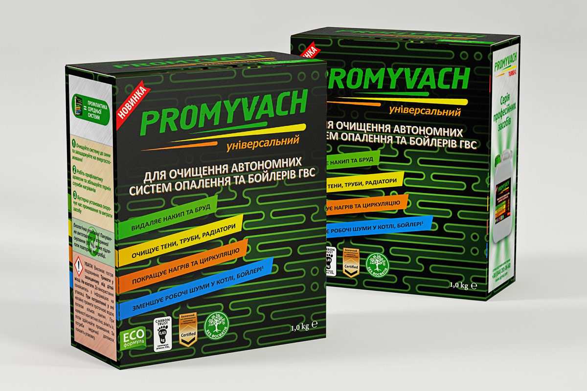До нашої студії звернулося керівництво компанії за розробкою дизайну логотипу, упаковки та етикетки для нового продукту ТМ “PROMYVACH” - догляд за автономною системою опалення (очитування). Споживча цінність продукту - видалення накипу, слідів корозії на внутрішній поверхні металів та полімерів, залишків хімічних речовин (мазут, відпрацьовані теплоносії), органічні грязі (цвіль, слиз, окалини тощо).