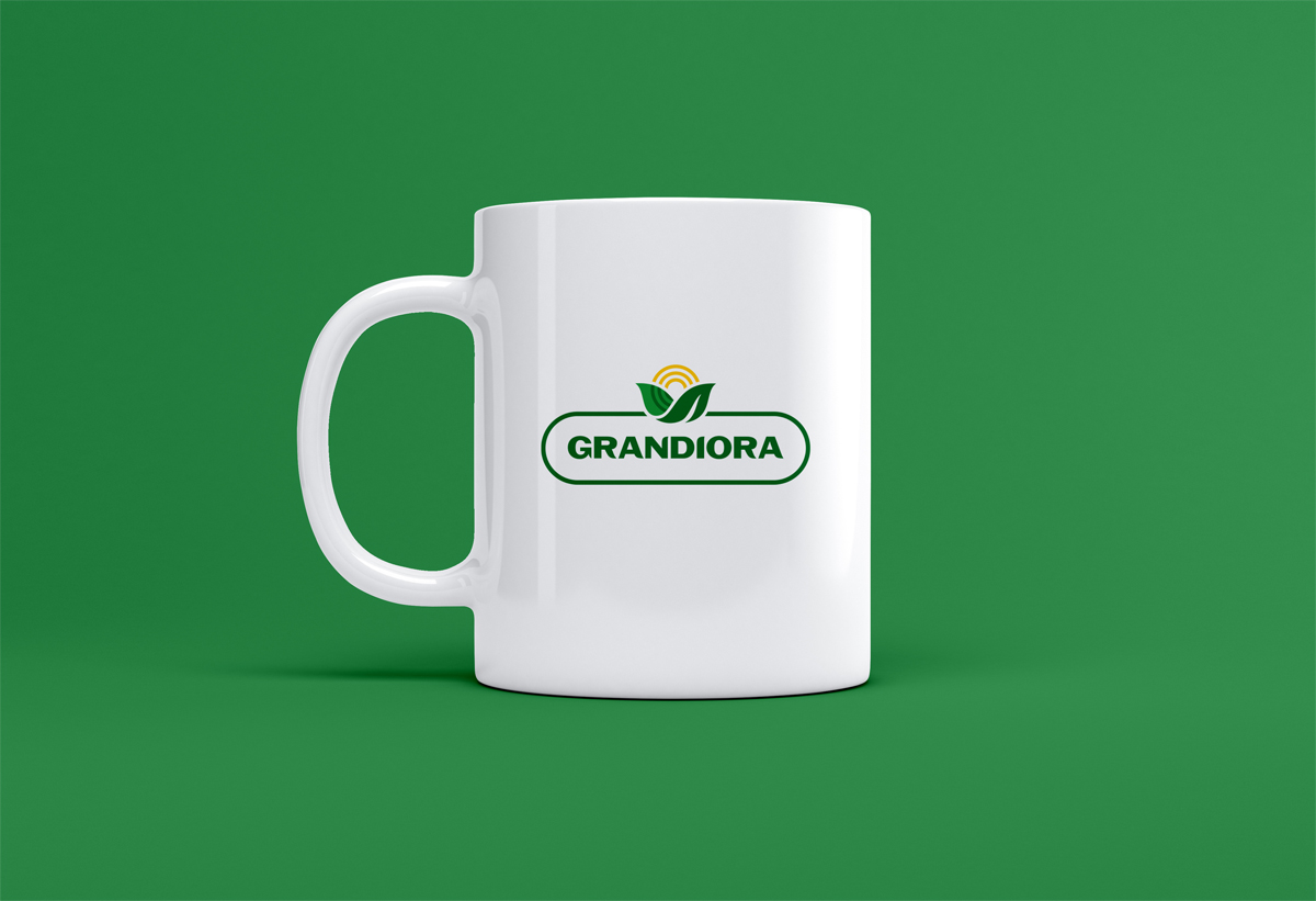 Логотип складається з назви торгової марки та знака у вигляді сонця та листочків. Шрифтове написання назви у логотипі “GRANDIORA” розроблено дизайнерами нашої студії та адаптовано під загальний стиль бренду.