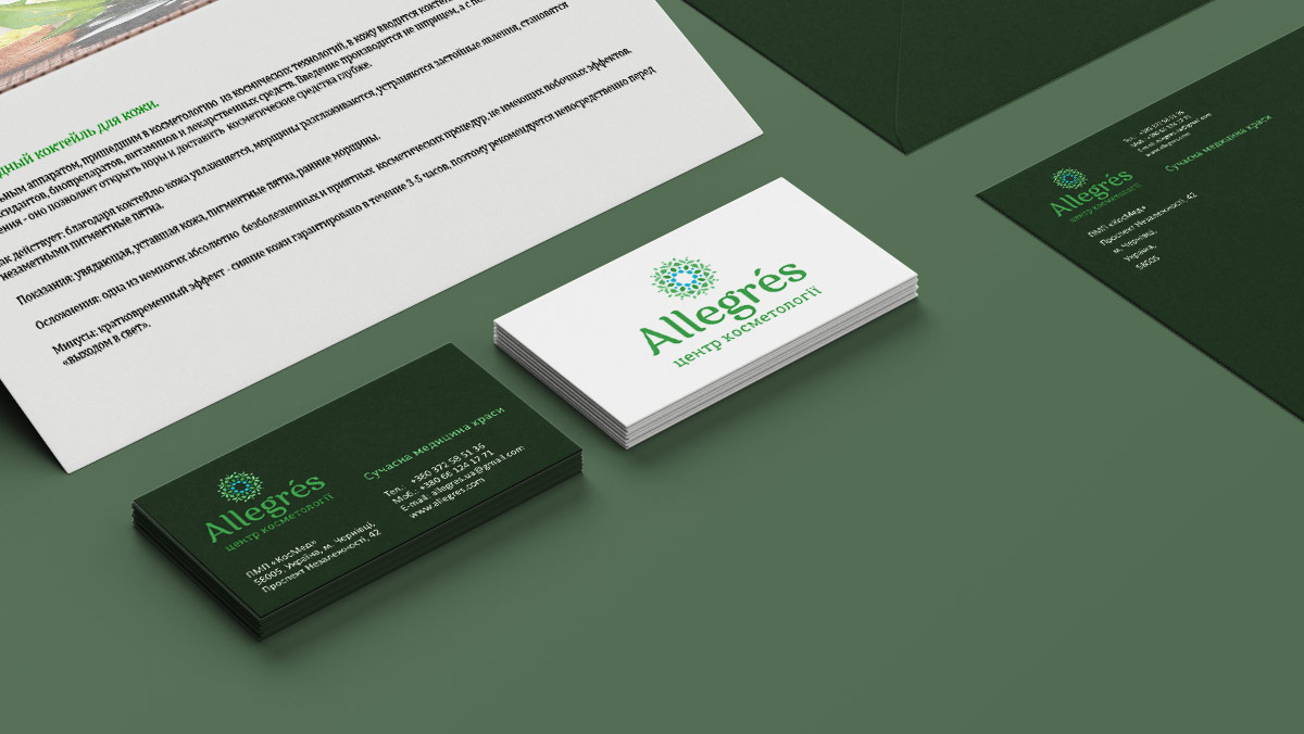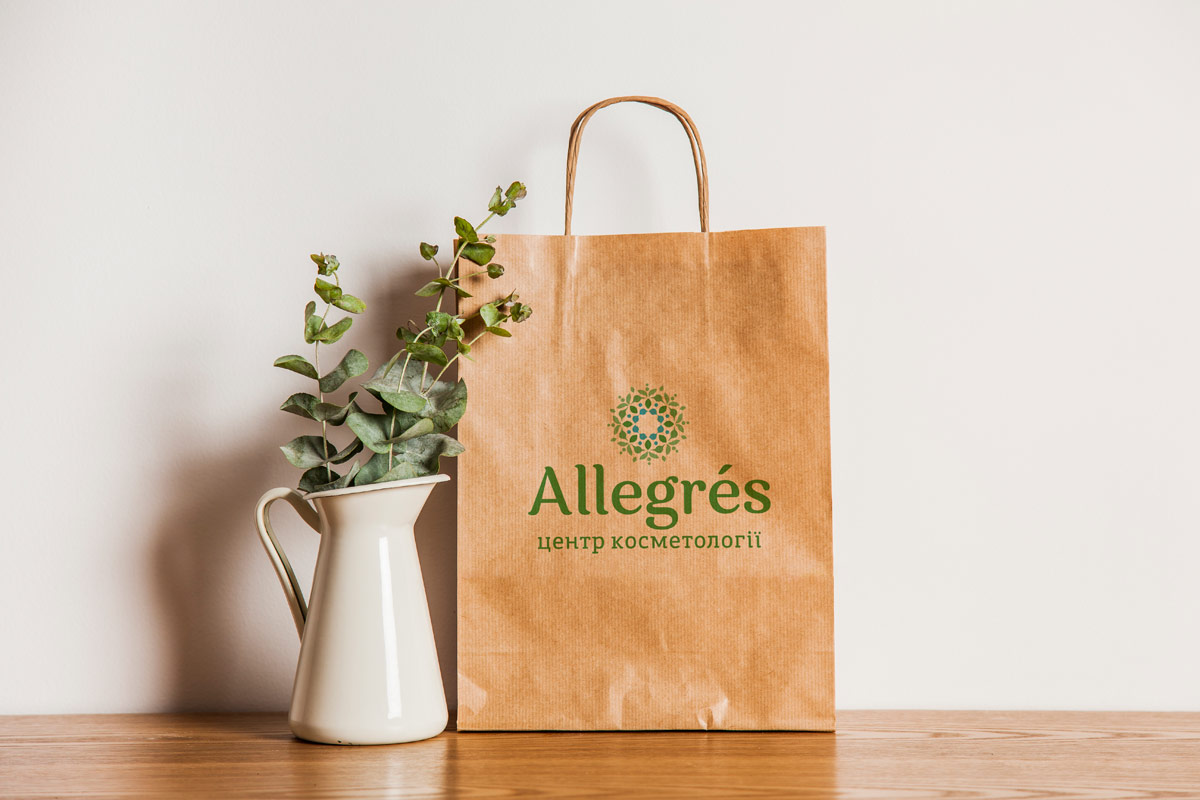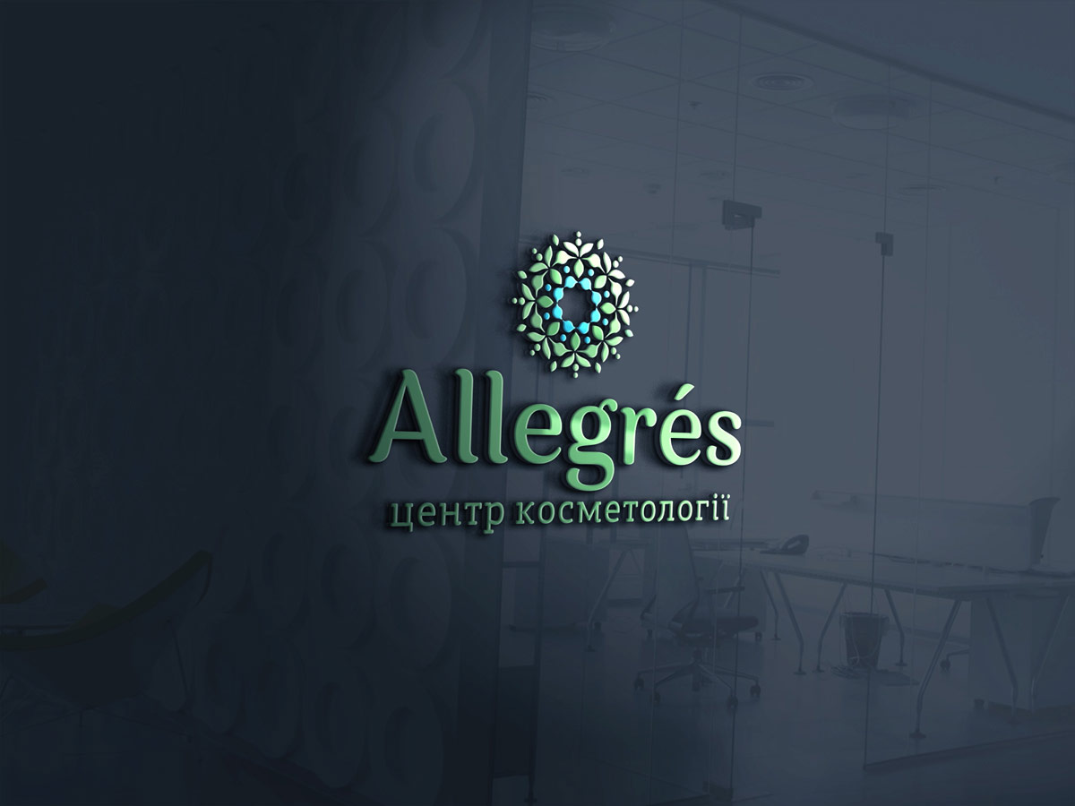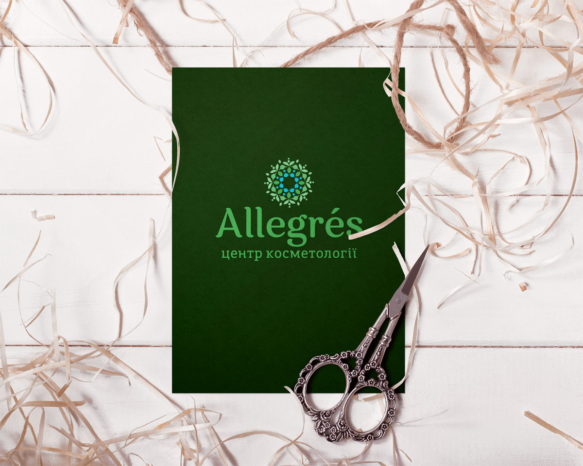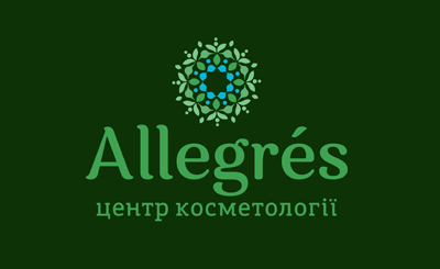 Шрифтове написання назви “Allegrés” у логотипі розроблено дизайнерами нашої студії та адаптовано під загальний стиль бренду. Для розшифровки діяльності було заведено використовувати в логотипі дескриптор “центр косметології”.