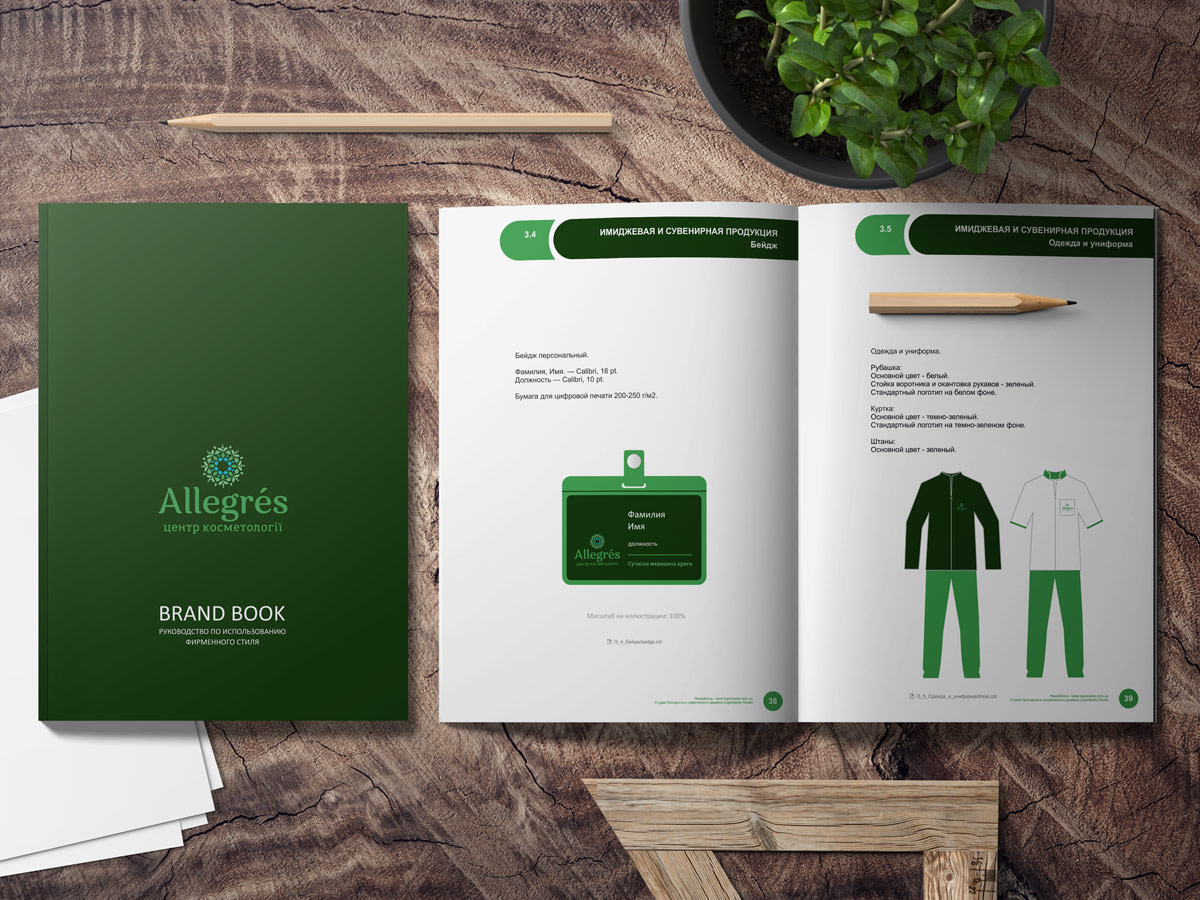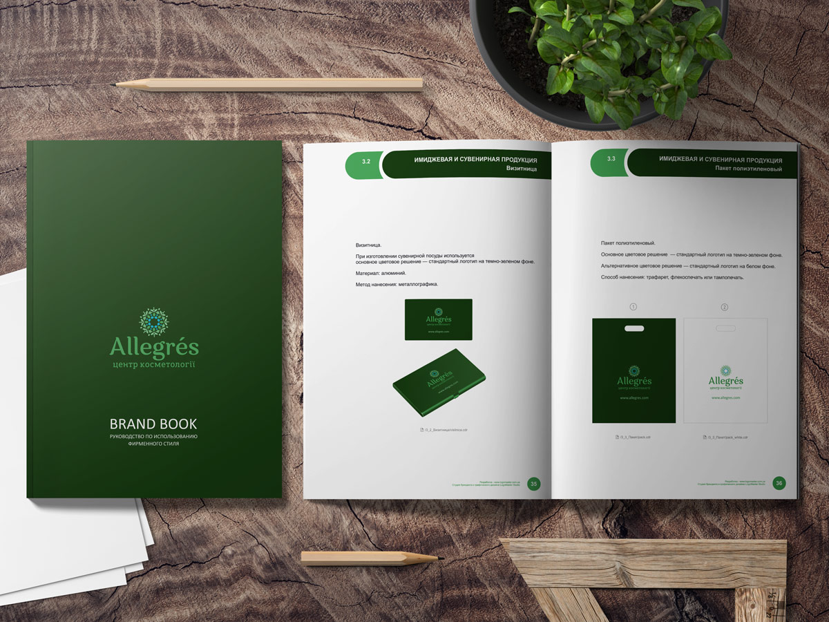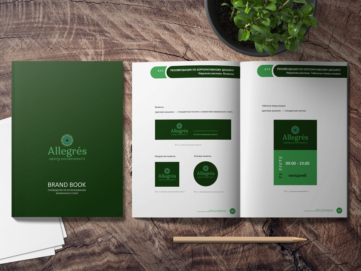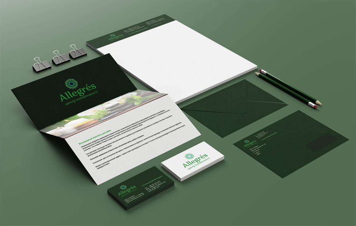 Шрифтове написання назви “Allegrés” у логотипі розроблено дизайнерами нашої студії та адаптовано під загальний стиль бренду. Для розшифровки діяльності було заведено використовувати в логотипі дескриптор “центр косметології”.