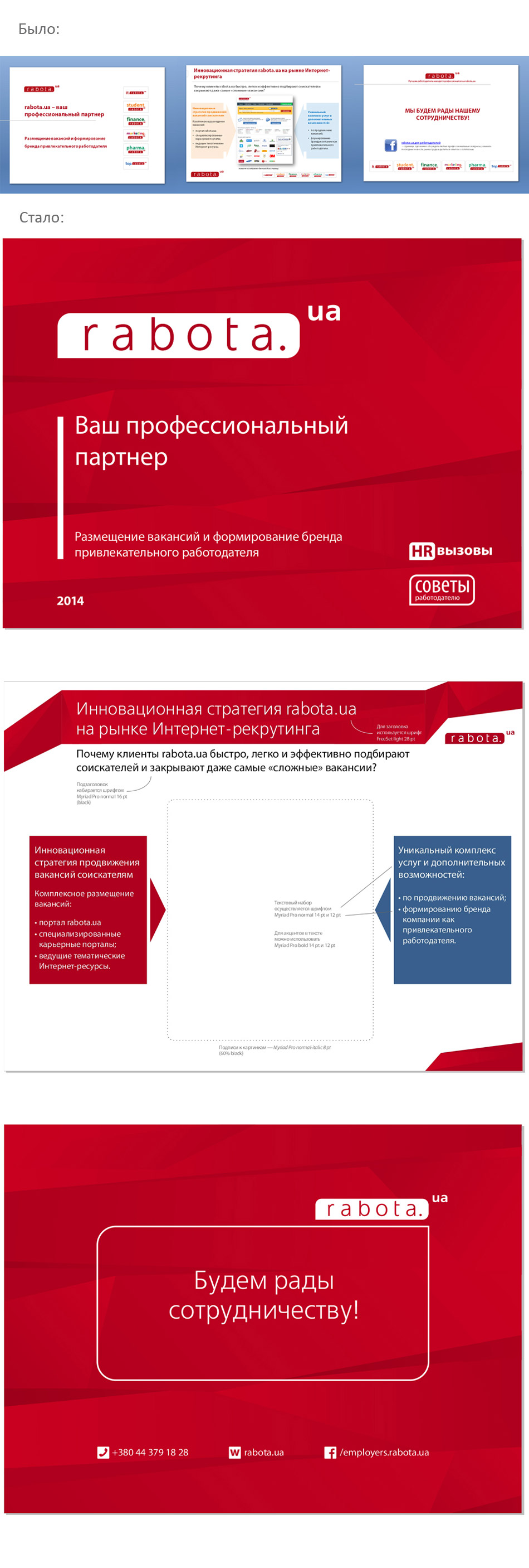 Замовником Rabota International LTD було поставлено завдання створення шаблону презентації rabota.ua та розробки нового фірмового стилю, оскільки в даний час старий бренд бук втратив свою актуальність.