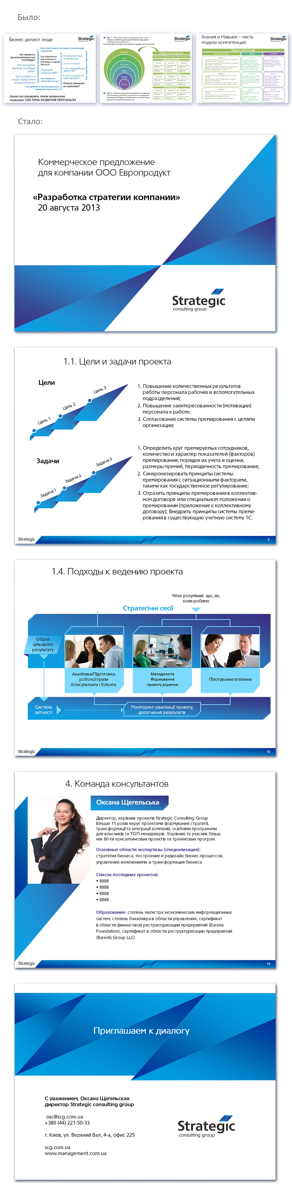 До студії звернулися за редизайном та оформленням презентації з розробки стратегії компанії. Необхідно було з урахуванням існуючого логотипу та фірмового стилю правильно подати та оформити різнопланову інформацію, створити спеціальний конструктор для комерційних пропозицій компанії.