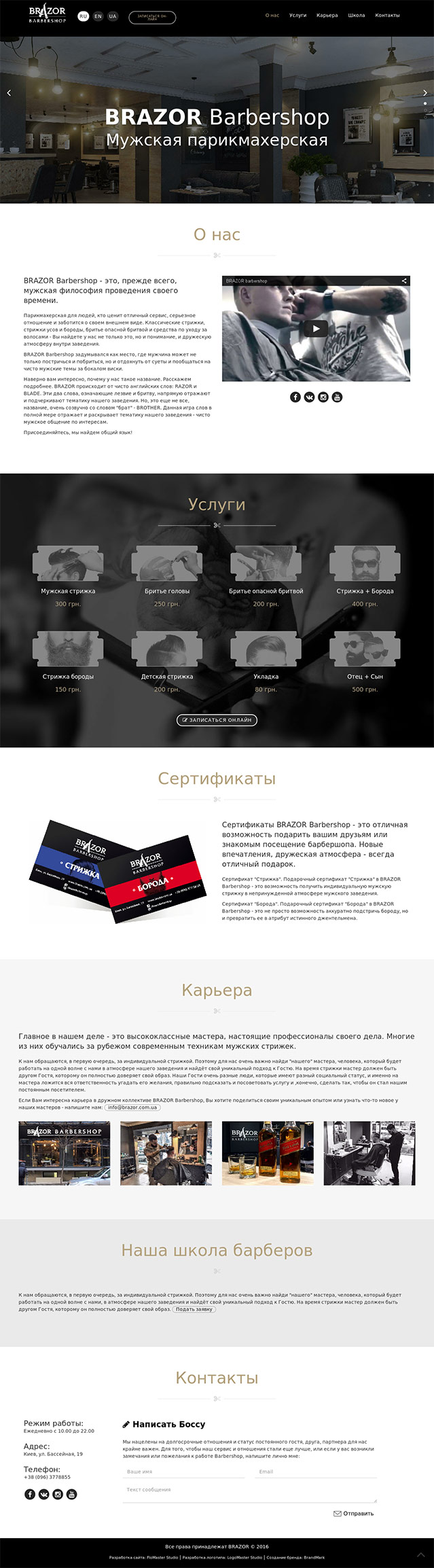 BRAZOR Barbershop - это, прежде всего, мужская философия проведения своего времени. Парикмахерская для людей, кто ценит отличный сервис, серьезное отношение и заботится о своем внешнем виде. Классические стрижки, стрижки усов и бороды, бритье опасной бритвой и средства по уходу за волосами - Вы найдете у нас не только это, но и понимание, и дружескую атмосферу внутри заведения.
