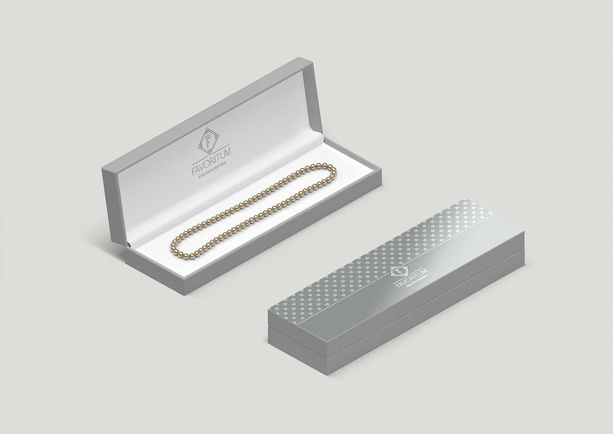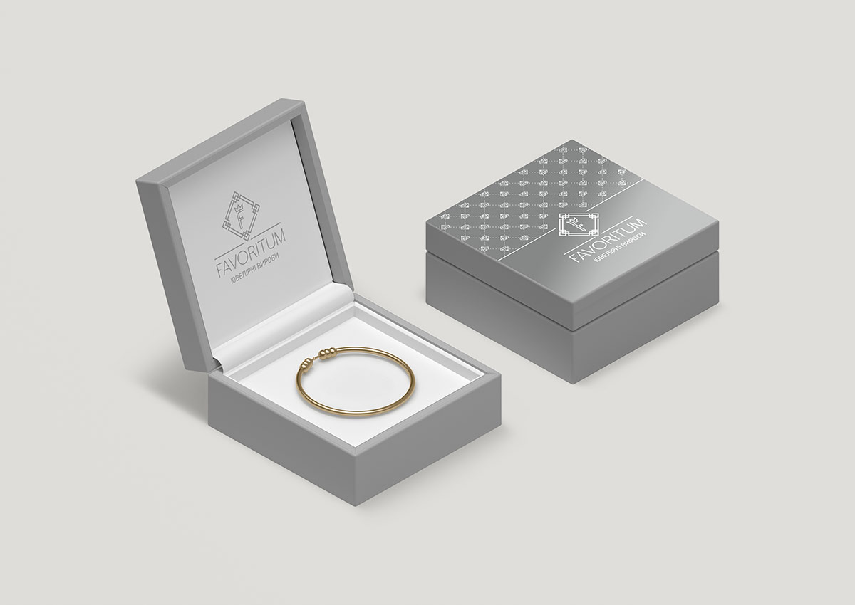 Логотип «FAVORITUM» с дескриптором «ЮВЕЛІРНІ ВИРОБИ» связан в классический вертикальный фирменный блок, что отражает дань уважения консервативным традициям ювелирного дела – точность, прочность и симметрия.