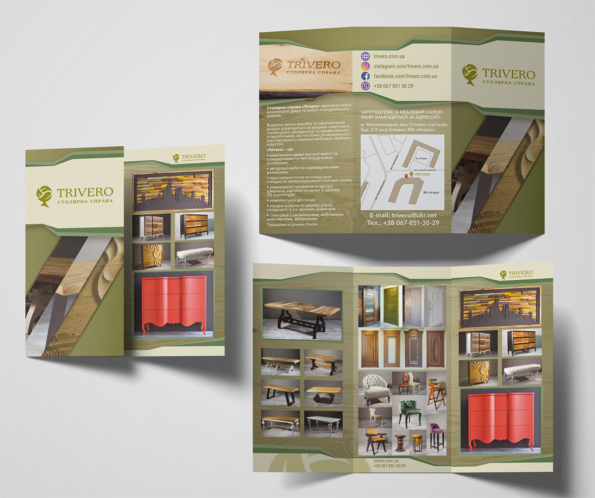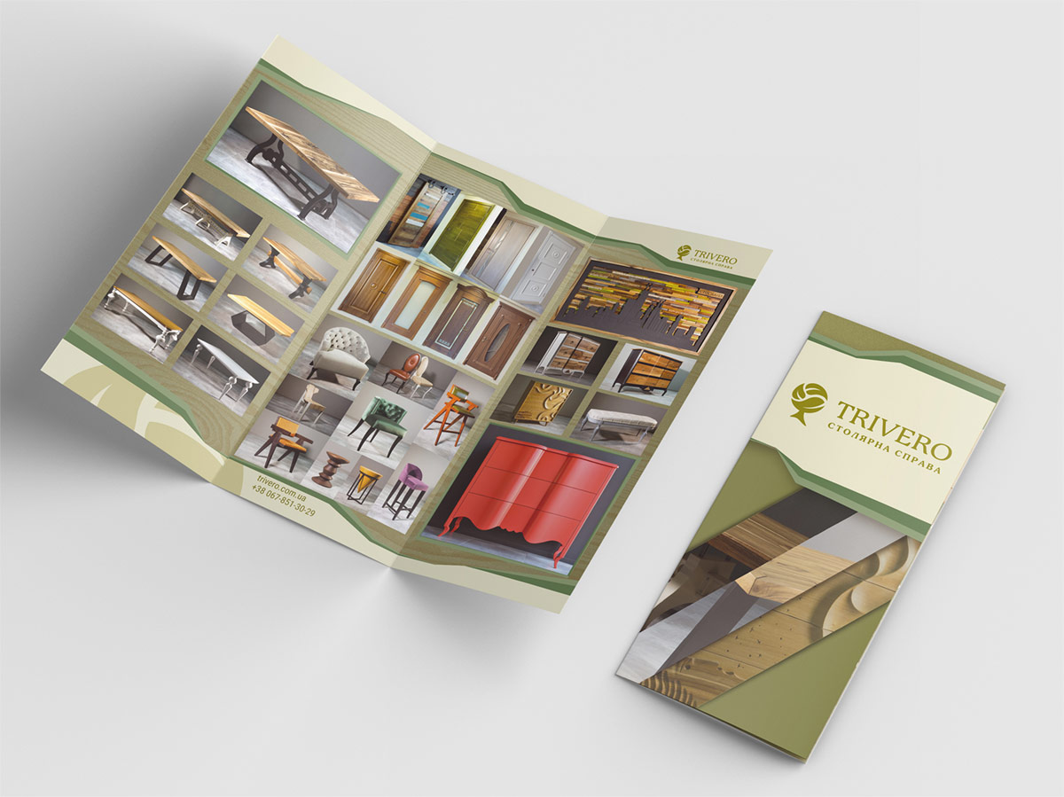 К разработке логотипа бренда Заказчиком были выдвинуты следующие требования – простотой в использовании и запоминаемый образ. Главное – это простота в способе будущего нанесения этого логотипа на различные поверхности. Логотип состоит из: знака в виде дерева, крона которого выполнена из трех листьев, названия “TRIVERO” и дескриптора “столярна справа”. Число три применено не случайно, т.к. символизирует ручной труд и человеческую любовь, которую компания вкладывает в каждое свое изделие.