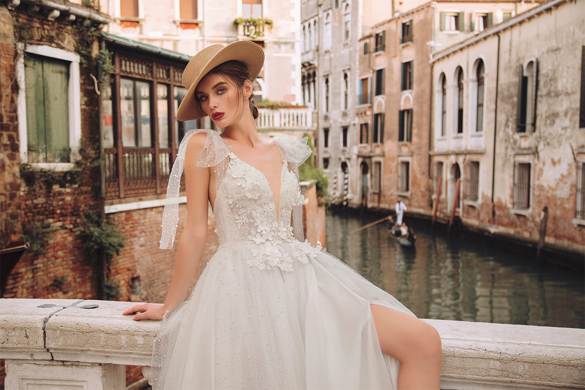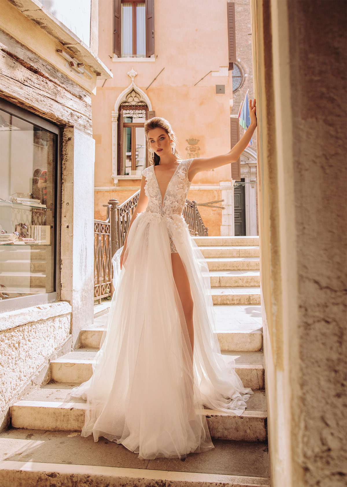 Индивидуальный стиль, полный женственной элегантности, в исполнении из тканей премиального уровня приобретает неповторимую роскошь, которая также отличает каждое свадебное платье этого бренда.