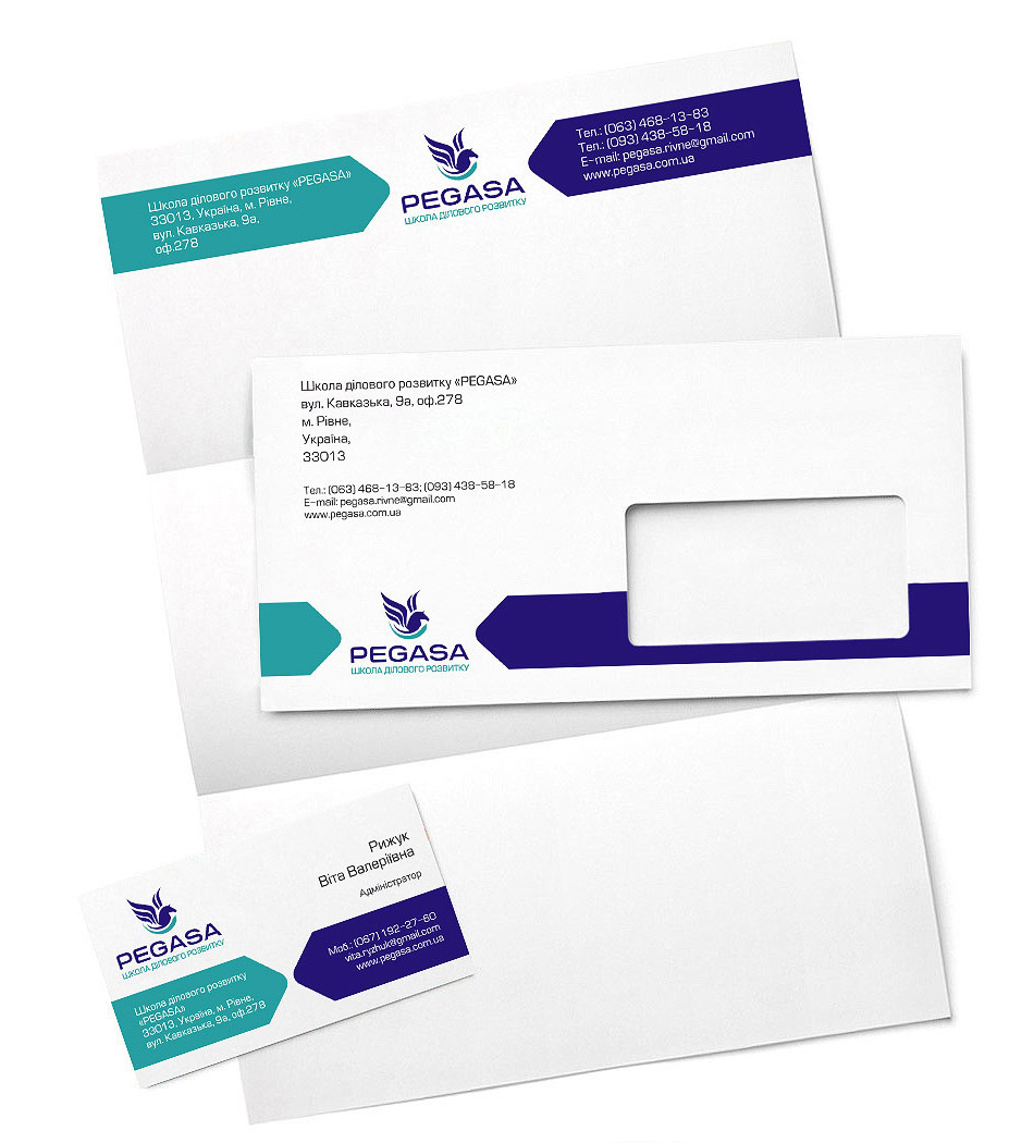У розробленому логотипі компанії використано символ Пегаса – як надійності, довіри та працьовитості школи, якій можна довіряти. Він яскраво символізує зростання та розвиток: пегас (символ піднесення, піднесення, красномовства, вміння донести свою думку) на зльоті та стрілочка під ним, яка спрямована праворуч - вгору, що означає зростання та розвиток, а також досягнення цілей.