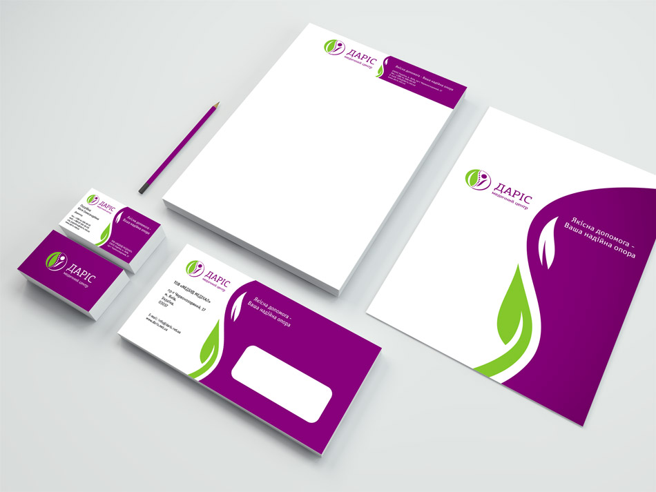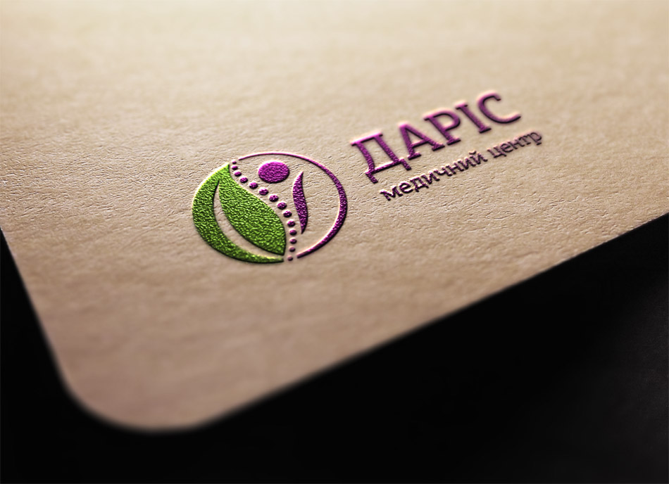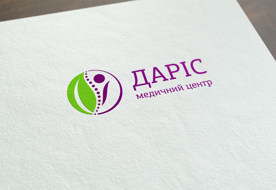 Логотип медичного центру ДАРІС виконано у життєрадісній кольоровій гамі. Фірмовий знак у логотипі відображає концепцію бренду – лікування це приємно, корисно та дає надію на нове життя без болю, що відображено у вигляді зеленого листочка, символу людини та хребта.