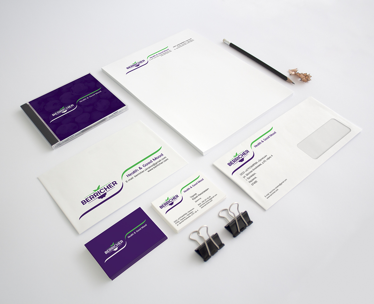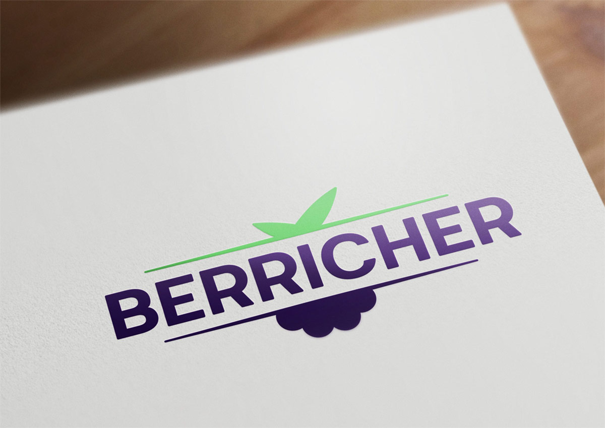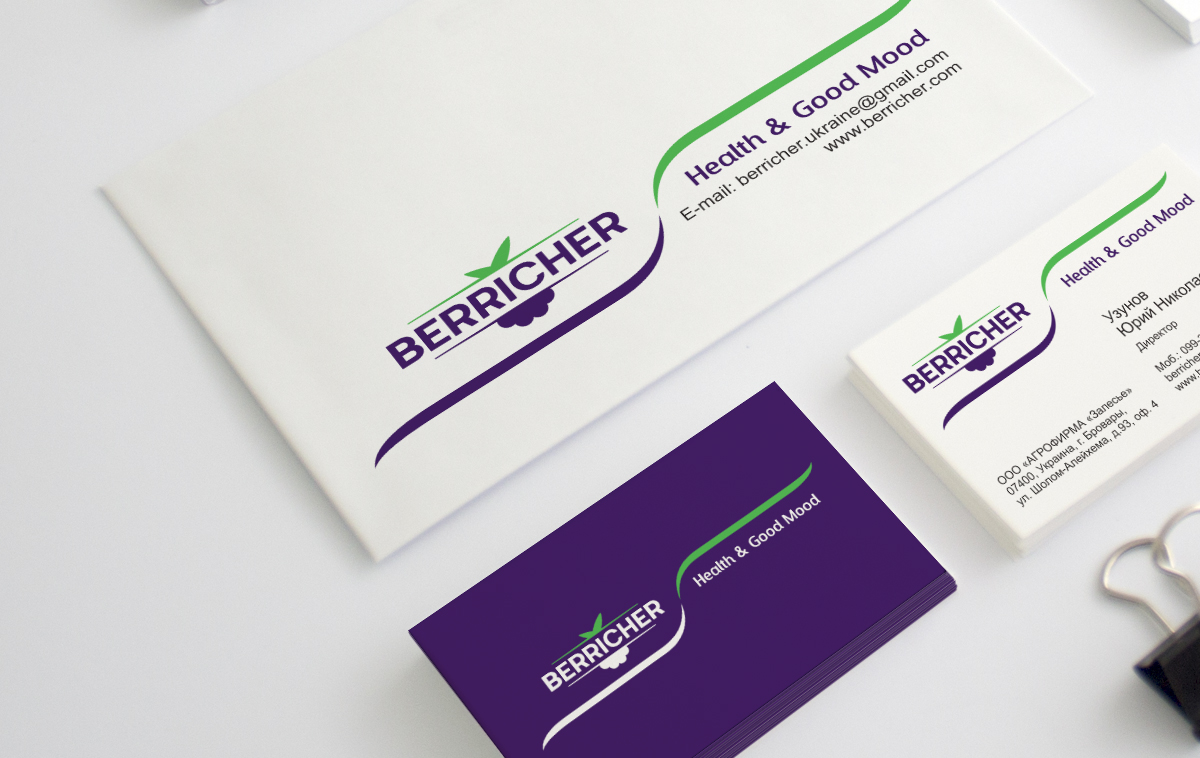 Колірне рішення логотипу виконане з використанням двох кольорів: зеленого та темно-фіолетового. Це поєднання досить рідкісне. Зелений колір відображає натуральну та екологічно чисту продукцію, а фіолетовий – колір ягоди ожини та лохини. Шрифтове написання назви “BERRICHER” у логотипі розроблено дизайнерами нашої студії та адаптовано під загальний стиль бренду.