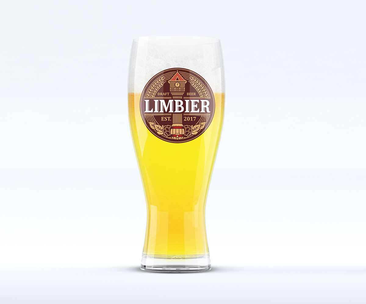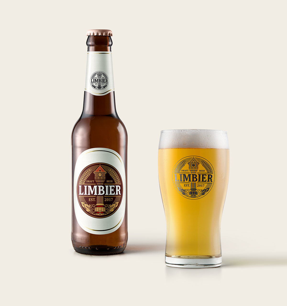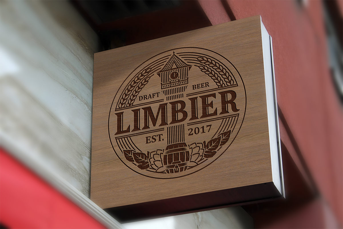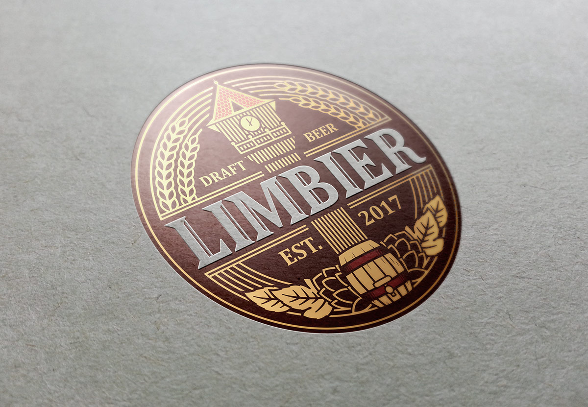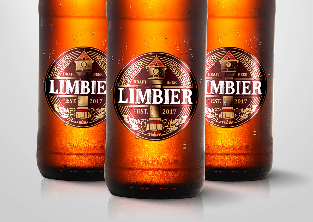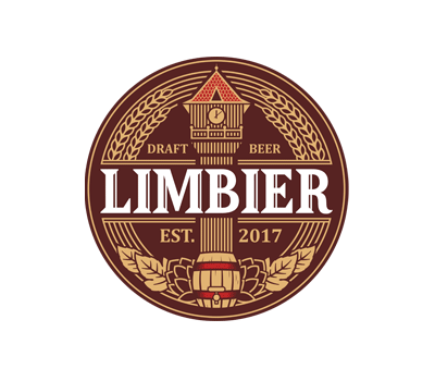 Тому було прийнято рішення розробити логотип як єдиного цілого – тобто. загальний дизайн знака та назва об'єднані у цілісний фірмовий круглий блок, що складається з вежі пивоварні (реальний об'єкт Замовника, в якому вариться пиво) та додаткових елементів – пивної бочки, хмелю та пшеничних колосків. Написання назви “LIMBIER” у логотипі розроблено дизайнерами нашої студії та виконано у стилістиці німецьких шрифтів 19 століття.