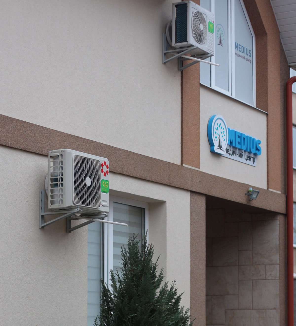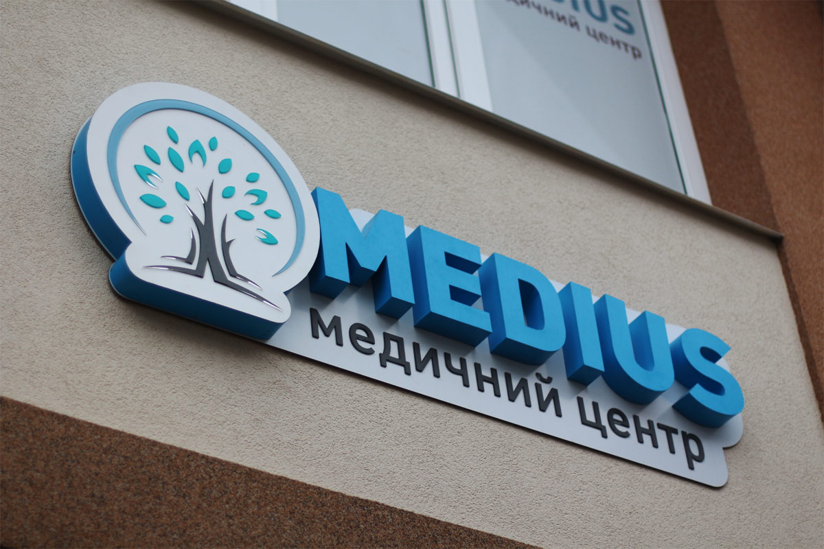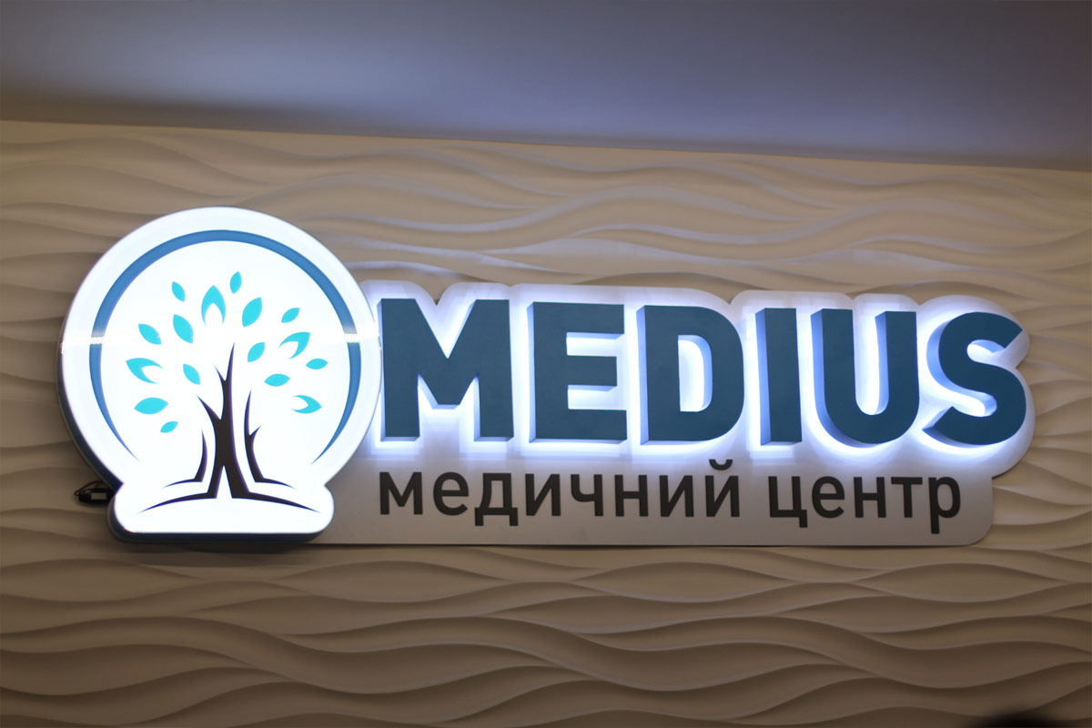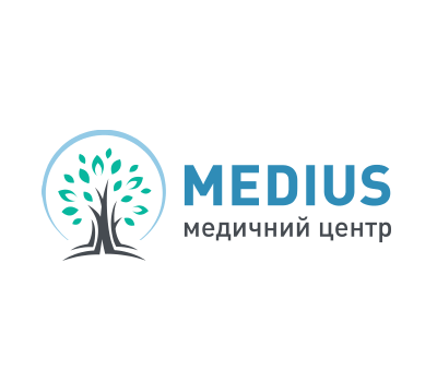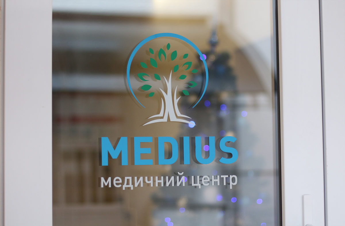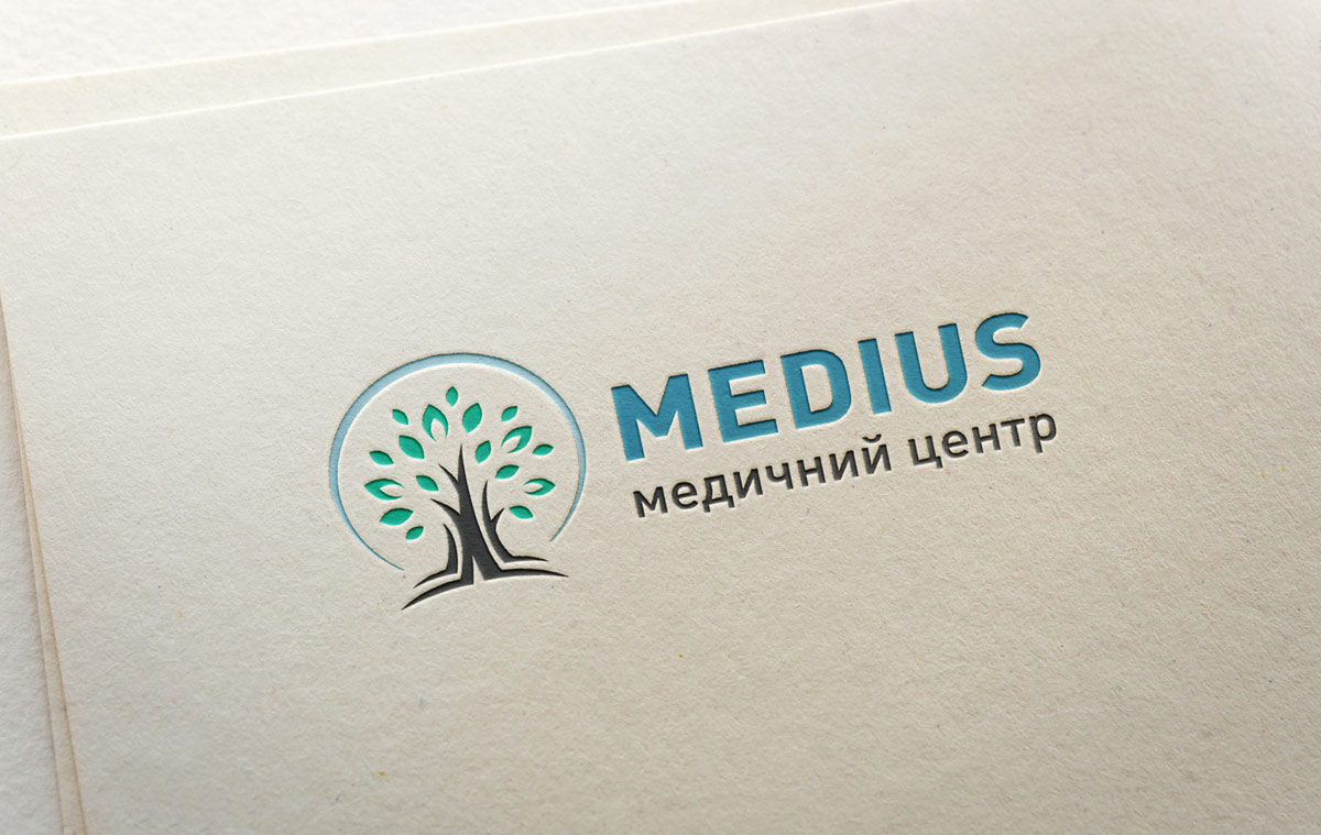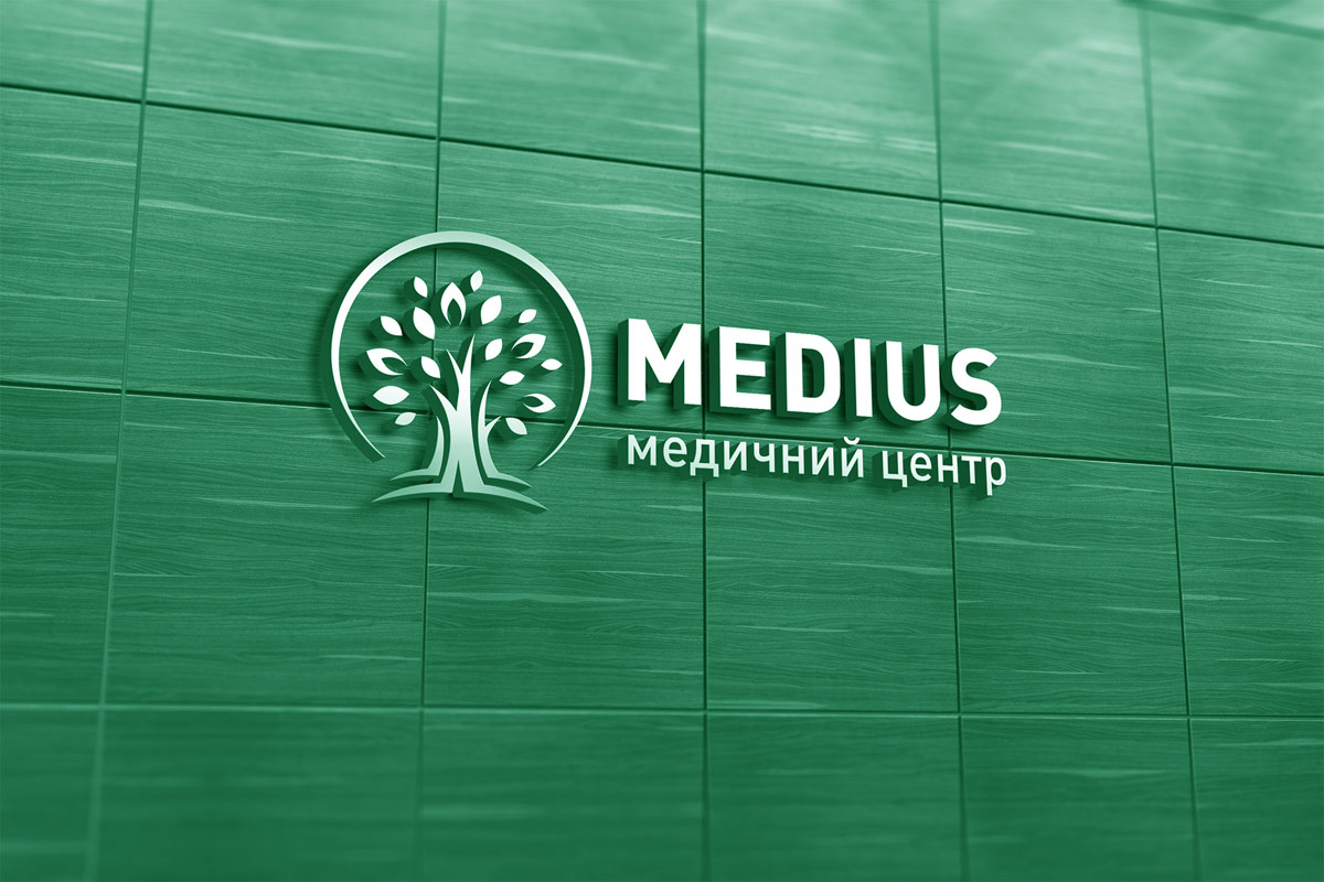 Шрифтове написання назви “MEDIUS” у логотипі розроблено дизайнерами нашої студії та адаптовано під загальний стиль бренду. Для розшифровки діяльності комплексу було прийнято використовувати в логотипі дескриптор МЕДИЧНИЙ ЦЕНТР.