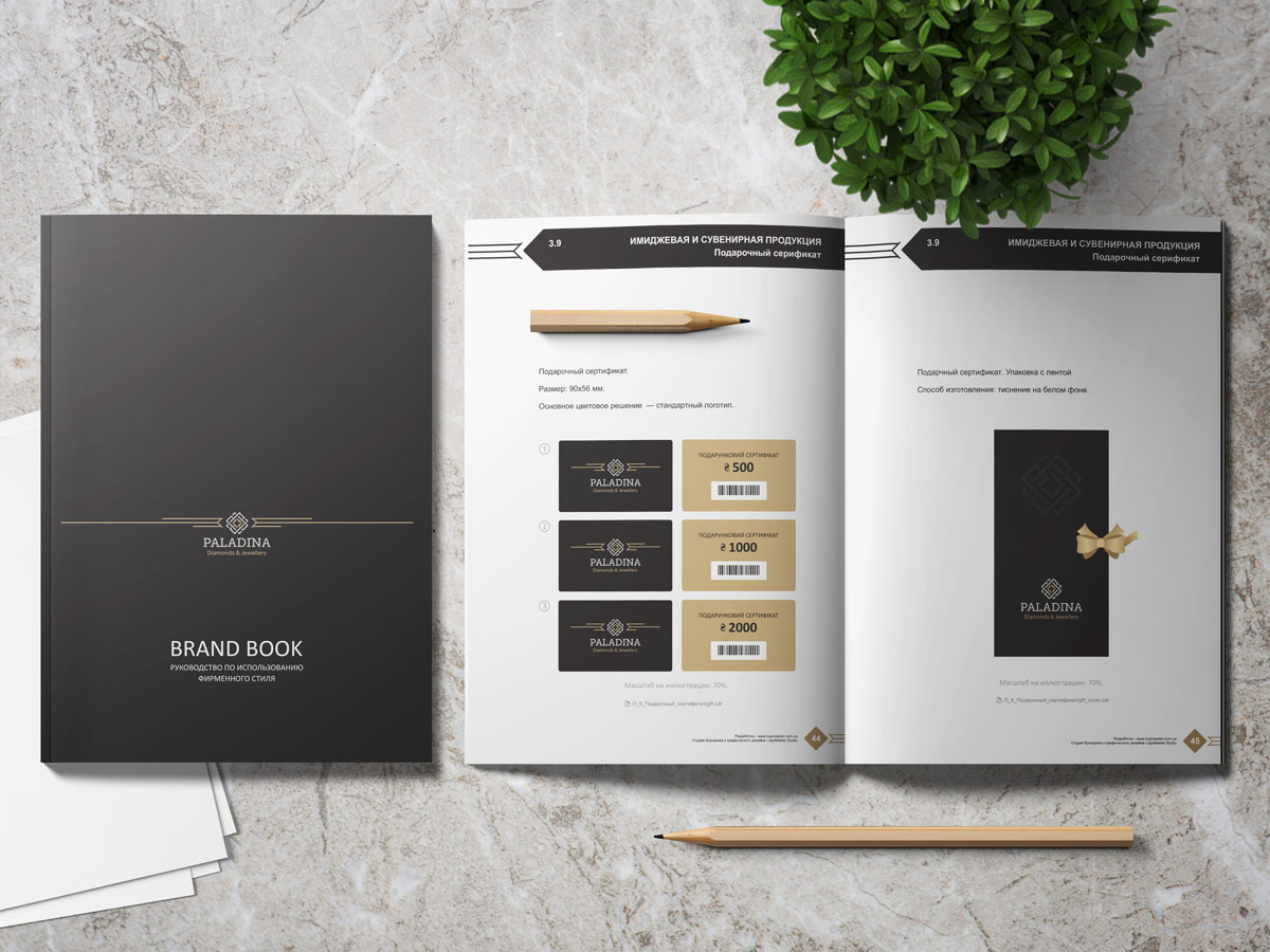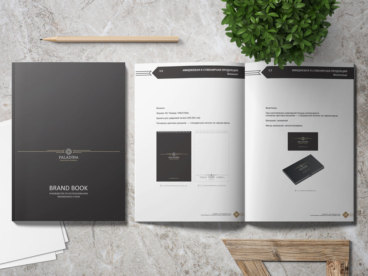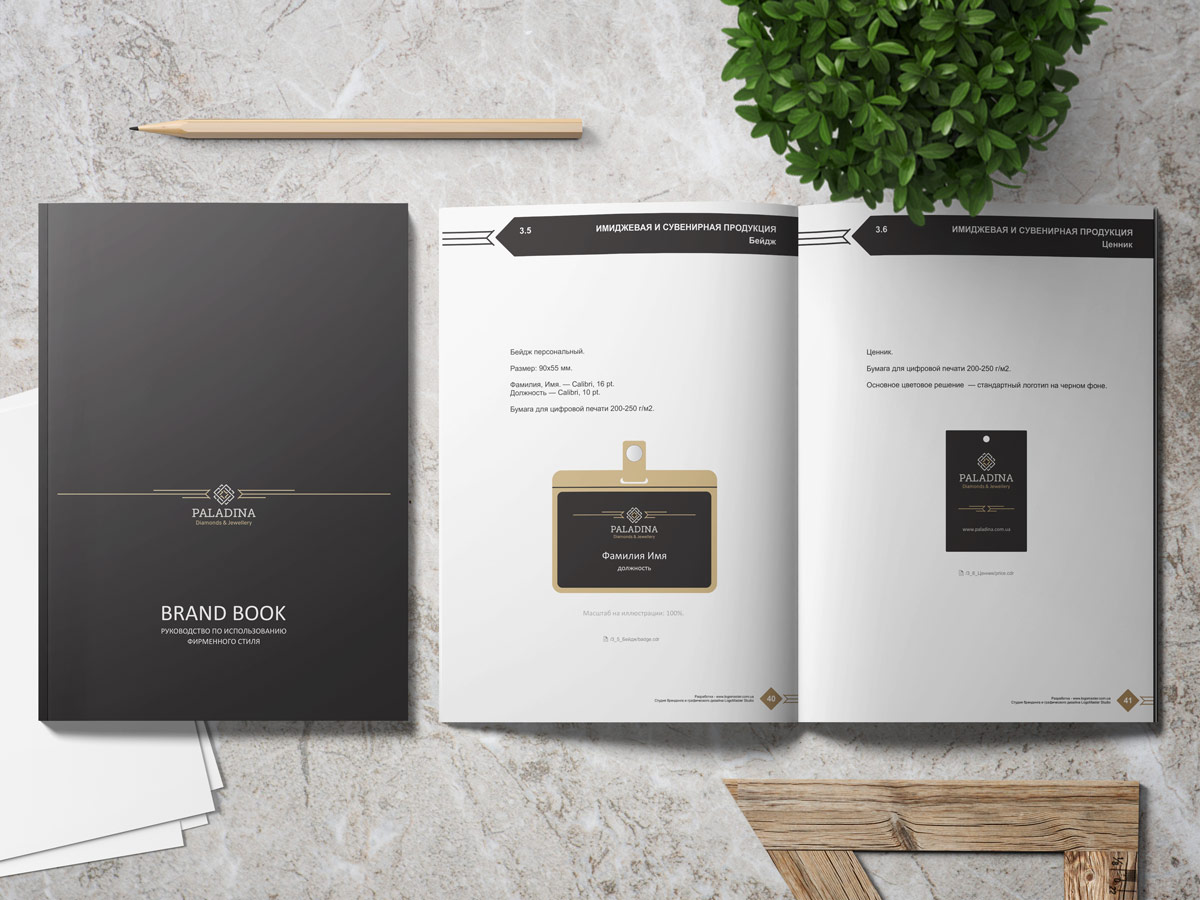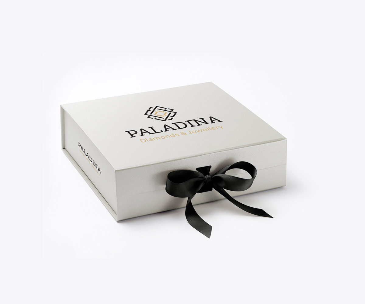 Шрифтове написання назви “PALADINA” у логотипі розроблено дизайнерами нашої студії та адаптовано під загальний стиль бренду. Для розшифровки діяльності було використано в логотипі дескриптор “Diamonds & Jewellery”.